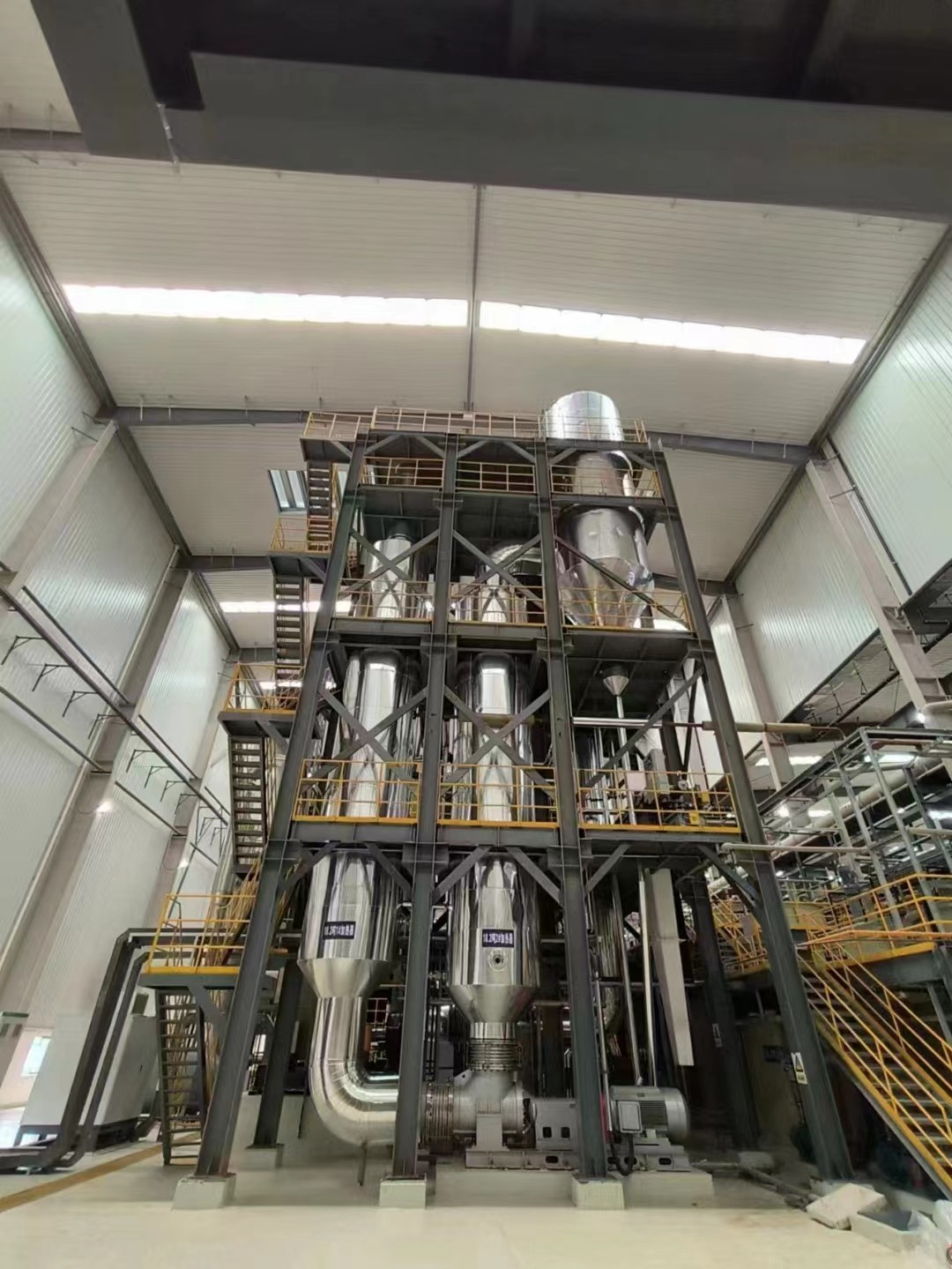 各效加熱器、各效分離器、冷凝器(混合式或表面式)、各效強(qiáng)制循環(huán)泵、冷凝水泵、真空泵、操作平臺、電器控制柜、液位自控系統(tǒng)及界內(nèi)管道閥門等組成。